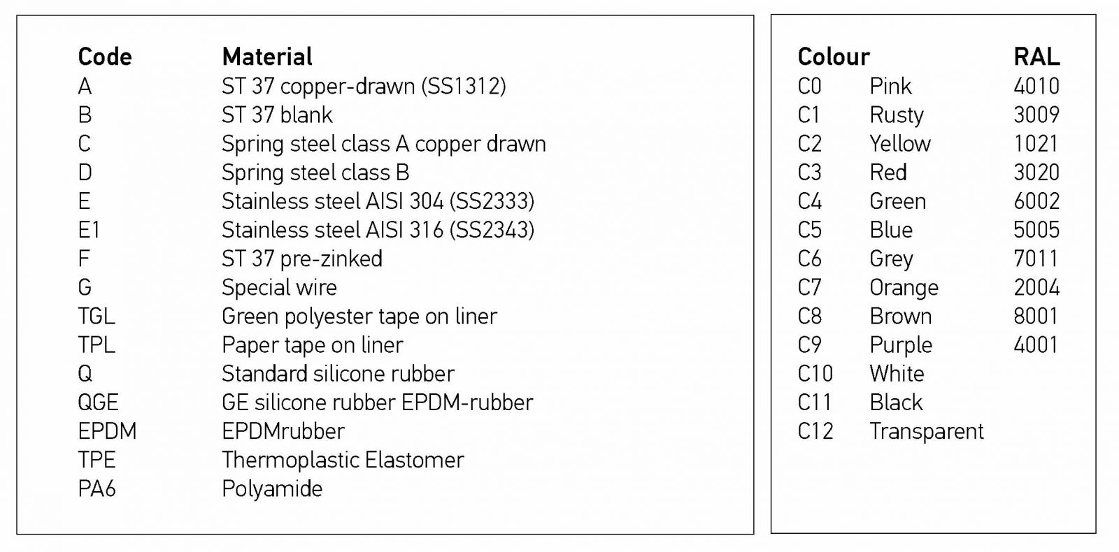 » Standard materials and colours: